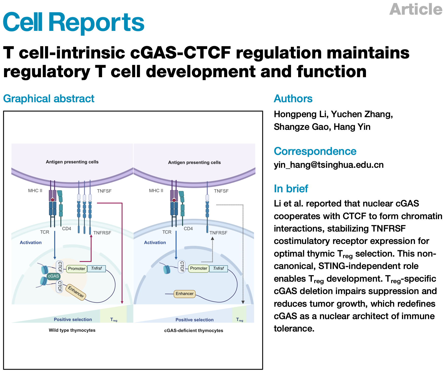 T cell-intrinsic cGAS-CTCF regulation maintains regulatory T cell development and function | Prof. Hang Yin