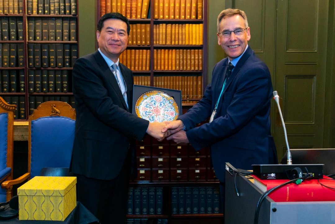 Dong Jiahong (left) and Tim Mitchell exchange commemorative gifts at the Royal College of Surgeons