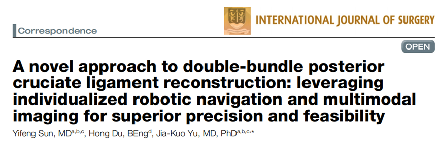 The related research findings were published in the International Journal of Surgery under the title "A novel approach to double-bundle posterior cruciate ligament reconstruction: leveraging individualized robotic navigation and multimodal imaging for superior precision and feasibility." Professor Yu Jia-Kuo is the corresponding author, and Dr. Sun Yifeng, an attending physician at the Orthopedics and Sports Medicine Center of Beijing Tsinghua Changgung Hospital, is the first author. This work was supported by a Beijing science and technology project.