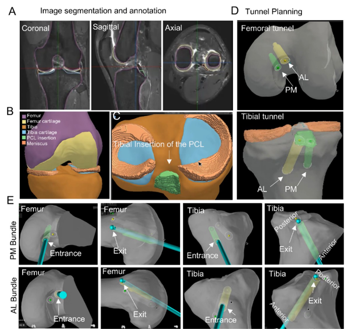 Leveraging this high-precision platform, the team successfully utilized the robot to drill two independent bone tunnels for the ALB and PMB on the femur, as well as two independent bone tunnels for the ALB and PMB on the tibia under precise navigation. Throughout the robot-assisted drilling of these tunnels, the integration of precise navigation and force feedback safety mechanisms effectively avoided critical neurovascular structures adjacent to the PCL—including the popliteal artery, popliteal vein, and tibial nerve—thereby enhancing surgical safety and anatomical fidelity (Figure 1). The approach also significantly reduced operative time, establishing a foundation for the patient's return to sports.