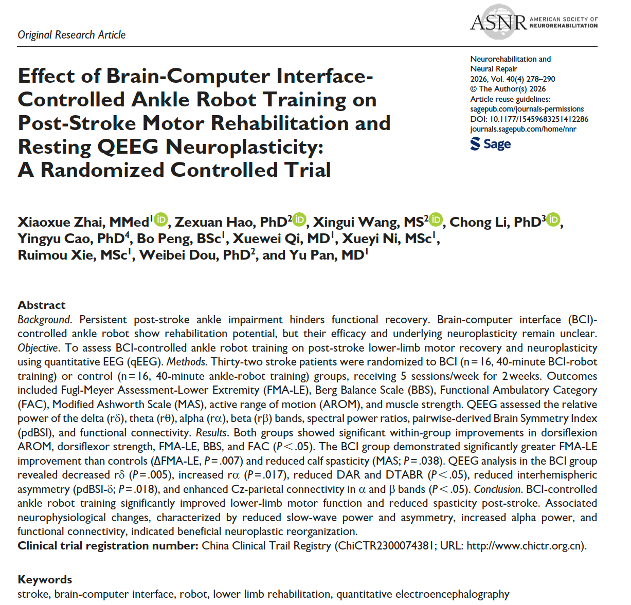 The paper, titled “Effect of Brain-Computer Interface-Controlled Ankle Robot Training on Post-Stroke Motor Rehabilitation and Resting QEEG Neuroplasticity: A Randomized Controlled Trial”, delves into how closed-loop brain-computer interface (BCI) ankle robot training based on motor imagery promotes lower limb motor function recovery and brain neuroplasticity in stroke patients through a rigorous randomized controlled trial.