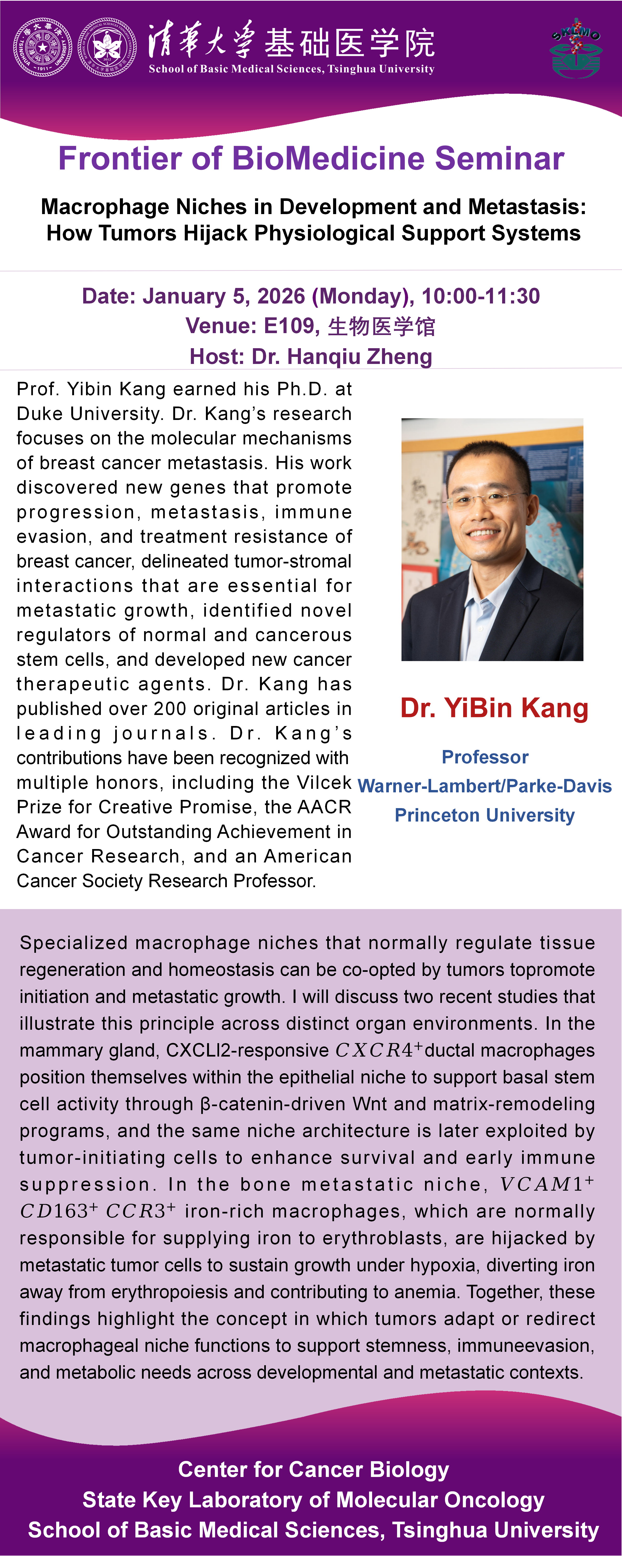 Time: January 5, 2026, 10:00–11:30Speaker: Professor YiBin KangTopic: Macrophage Niches in Development and Metastasis: How Tumors Hijack Physiological Support SystemsVenue: Conference Room E109, Biomedical Hall, Tsinghua University