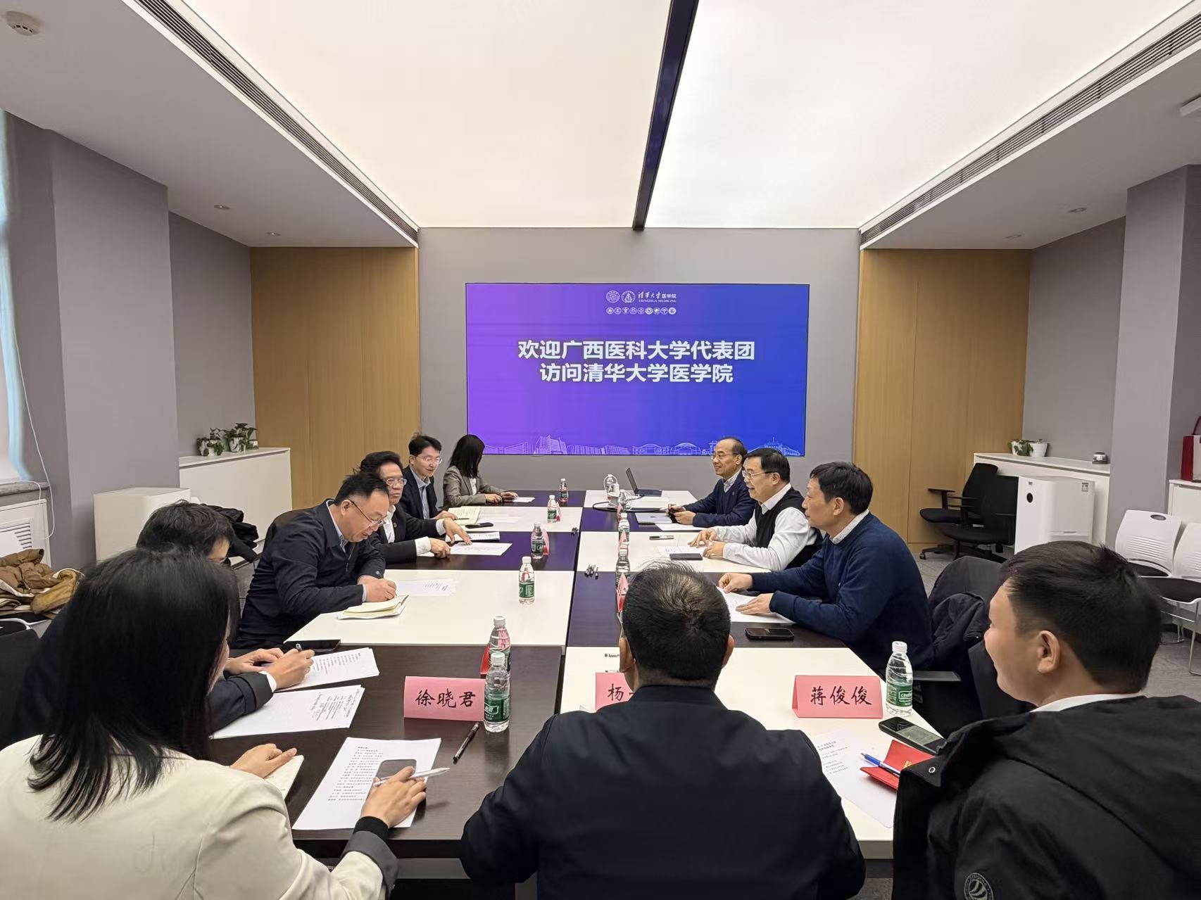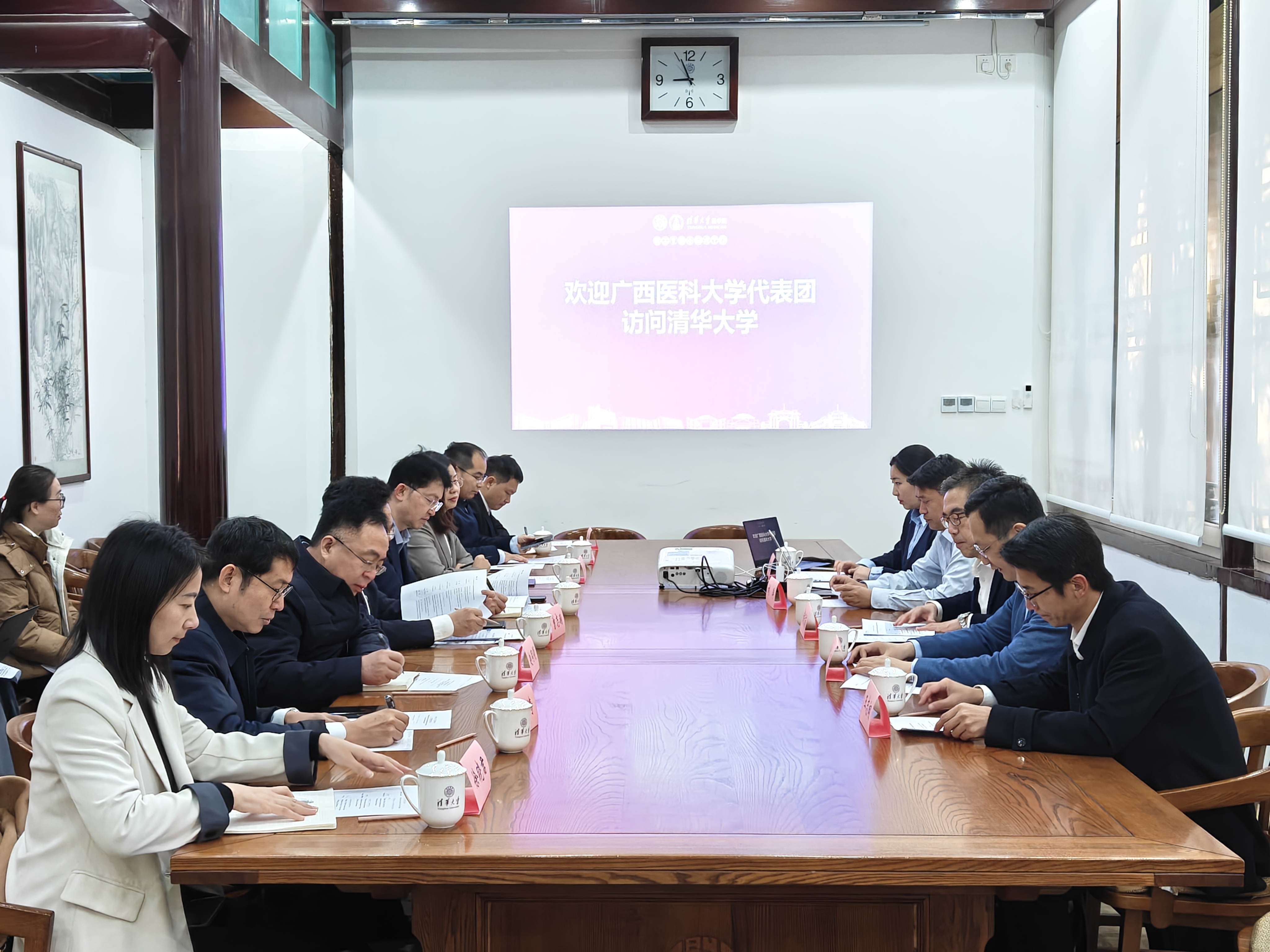 12 月 8 日,广西医科大学党委副书记、校长曾志羽一行访问清华大学医学院,围绕人工智能医院建设等议题进行专项调研交流。清华大学副教务长、医学院院长黄天荫参加会见。