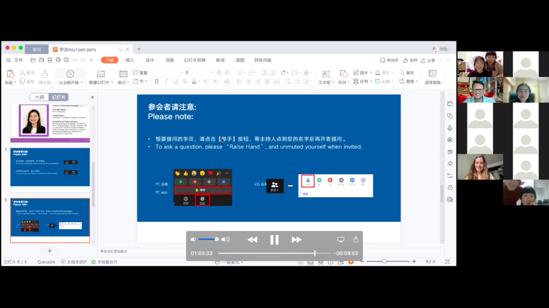 7月15日晚,系列讲座的第一位演讲者Yee Chin Mun校友向听众们进行了介绍和分享。Yee Chin Mun校友是2019年度的“安进学者”中一位优秀毕业生,在讲座中,她首先介绍了个人经历。2019年7月1日至8月23日,她作为“安进学者”进入丁胜老师的实验室参与贝敦氏病(batten disease)的学习与研究。在讲座的前半部分,Yee Chin Mun从微观角度对病理机制作了大致的介绍,然后围绕靶点介绍了光活化(photoactivation)、孵化(incubation)等步骤,展现了清晰的治疗思路。讲座的后半部分,她则向同学们分享了在清华求学期间的一些难忘的经历。比如和来自不同国家的年轻学者们体验、在闭幕典礼上介绍自己在此次项目中的学术成果和来自不同国家的年轻学者们一起体验中国文化等。