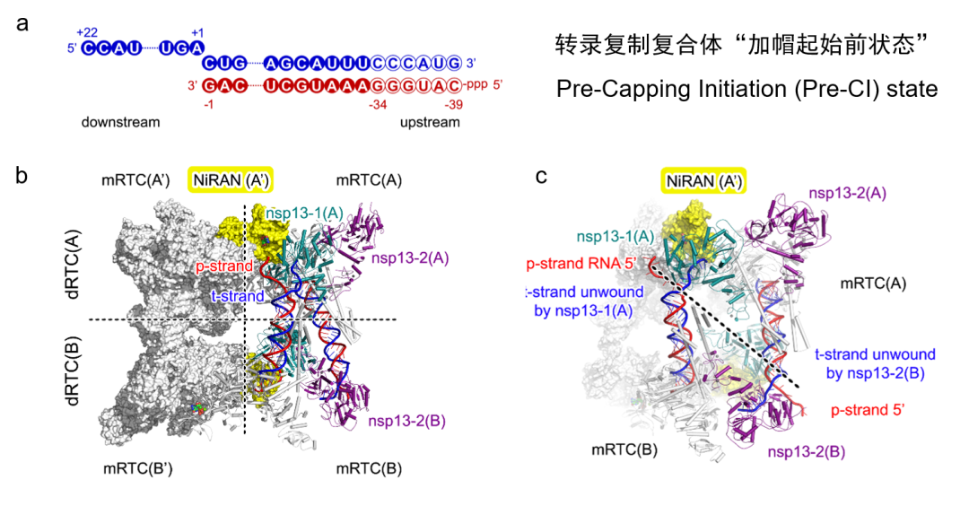 图2. (a)组装加帽起始前状态复合体所使用的RNA骨架。(b)加帽起始前状态复合体的四聚体全貌。(c)加帽起始前状态复合体中“模板-产物”双链RNA的解旋。