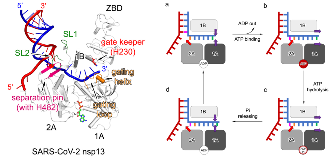 图3. 左图,新冠病毒解旋酶的关键结构单元。右图,ATP水解驱动的双链RNA解旋模式图。