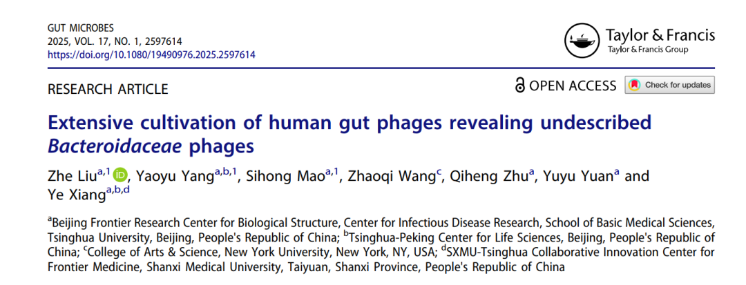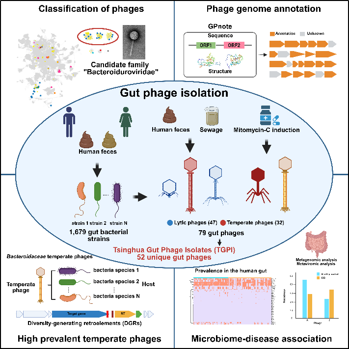2025年12月9日,清华大学基础医学院向烨团队在期刊Gut Microbes上发表题为“Extensive cultivation of human gut phages revealing undescribed Bacteroidaceae phages”的研究论文。该研究通过大规模培养与分离,成功获得一系列裂解型及温和型肠道噬菌体并构建了相应的噬菌体资源库。进一步团队测定了所分离噬菌体的基因组序列,开发了基于结构的噬菌体基因功能注释工具,实现了对所分离噬菌体57.5%基因的功能注释,并基于此进行聚类分析发现一个全新的拟杆菌噬菌体家族,为深入解析肠道微生物组的调控机制提供了重要资源与工具。