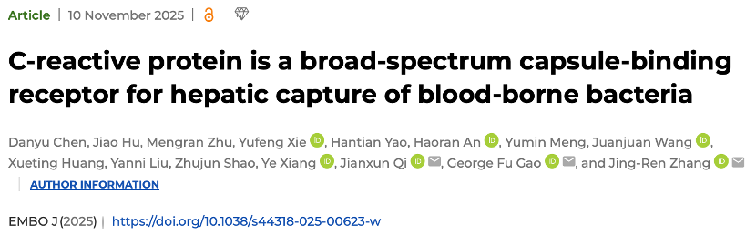 近日,清华大学基础医学院传染病中心张敬仁课题组与中国科学院微生物研究所高福院士课题组合作,在The EMBO Journal杂志发表了题为 “C-reactive protein is a broad-spectrum capsule-binding receptor for hepatic capture of blood-borne bacteria” 的研究论文,首次揭示CRP为结合细菌荚膜多糖的广谱模式识别受体。CRP可以特异性结合20多种荚膜型的革兰氏阳性和阴性细菌,其中包括肺炎链球菌、流感嗜血杆菌和肺炎克雷伯菌等常见人类病原体。CRP 标记的细菌在血液循环中被肝脏巨噬细胞快速捕获和清除,由此维持血液无菌状态和提供强大天然免疫保护。CRP 缺陷小鼠完全丧失从血液循环中清除相关细菌的免疫力,对这些的病原体的抵抗力下降一万多倍。