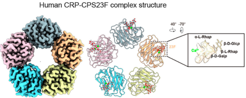 图1. C反应蛋白与肺炎链球菌23F荚膜多糖复合物结构(摘自文章Figure 7)