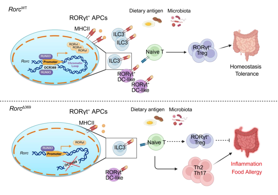 综上,本研究首次鉴定出特异性调控RORγt⁺ APCs的顺式调控元件OCR369,阐明了其通过RUNX3结合与染色质环形成维持RORγt高表达的分子机制,并揭示了其在协同调控食物与微生物抗原耐受、维持肠道稳态中的关键作用。研究还提出了RORγt⁺ APC亚群在生命不同阶段功能分工的新模型,强调了其协同维持食物耐受的动态调控机制。OCR369的发现不仅加深了对ILC3与T细胞RORγt调控机制差异的理解,也为靶向RORγt⁺ APCs治疗食物过敏和炎症性肠病等疾病提供了新靶点。