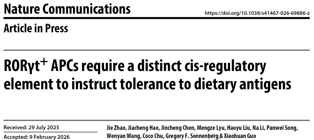 近日,清华大学基础医学院郭晓欢课题组在《Nature Communications》在线发表题为“RORγt⁺ APCs require a distinct cis-regulatory element to instruct tolerance to dietary antigens”的研究论文。该研究首次鉴定出一个特异性调控RORγt⁺ APCs的顺式调控元件OCR369,揭示了其通过招募RUNX3及介导染色质环形成等机制,维持ILC3s等RORγt⁺天然免疫细胞中RORγt的表达,进而调控食物抗原特异性Treg分化及口服耐受建立。该发现不仅阐明了RORγt在RORγt⁺ APCs中与T细胞不同的调控模式,也为理解其在肠道免疫耐受中的功能提供了新视角。