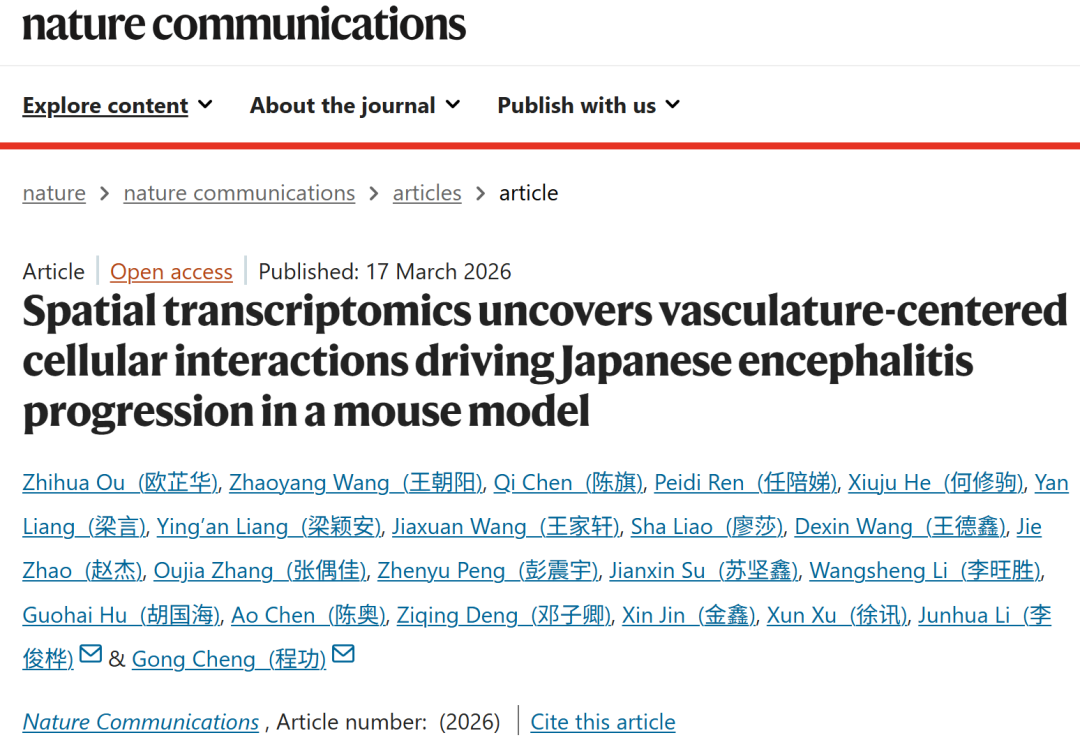 清华大学基础医学院程功教授课题组与华大生命科学研究院李俊桦研究员课题组合作,于3月17日在Nature Communications杂志在线发表了题目为“Spatial transcriptomics uncovers vasculature-centered cellular interactions driving Japanese encephalitis progression in a mouse model”的研究论文(图1)。该研究利用定制化的Stereo-seq空间转录组学芯片和小鼠模型,构建了从JEV侵染脑部到引发广泛炎症及组织损伤的高精度时空图谱,发现脑血管系统,尤其是脑膜区域,是病毒感染后的炎症与细胞死亡枢纽,并且脑膜Ackr1⁺内皮细胞和Ly6c2⁺单核细胞协同促进病毒扩散,加重脑部炎症。