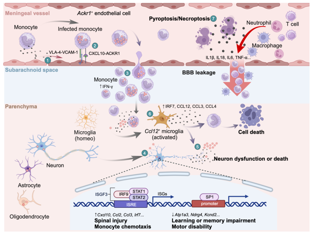总体而言,该研究通过定制化空间转录组技术,整合多组学分析,在空间和细胞尺度上解析了JEV急性感染期脑微环境的变化。主要发现包括:1) JEV可能通过直接感染脑微血管内皮细胞及“特洛伊木马”机制入侵中枢神经系统;2) 单核细胞是JEV的主要载体,同时作为脑实质内IFN-γ的主要来源,更新了现有神经炎症反应范式;3) 阐明了Ackr1⁺内皮细胞和小胶质细胞活化相关的基因调控网络;4) 鉴定了Ackr1⁺内皮细胞介导免疫细胞募集的特定受体-配体对,特别是其与Ly6c2⁺单核细胞的相互作用;5) 细胞焦亡和坏死性凋亡为主要的细胞死亡方式,且可能主要由单核细胞衍生的信号介导;6) 揭示了脑血管系统,尤其是脑膜区域,是感染期炎症反应和细胞死亡的核心区域;7) 鉴定了与JEV感染所致神经系统病变相关的一系列关键基因。本研究构建了乙脑发病机制的综合空间细胞图谱,为开放针对乙脑及其它嗜神经病毒感染疾病的靶向治疗策略提供了参考依据。