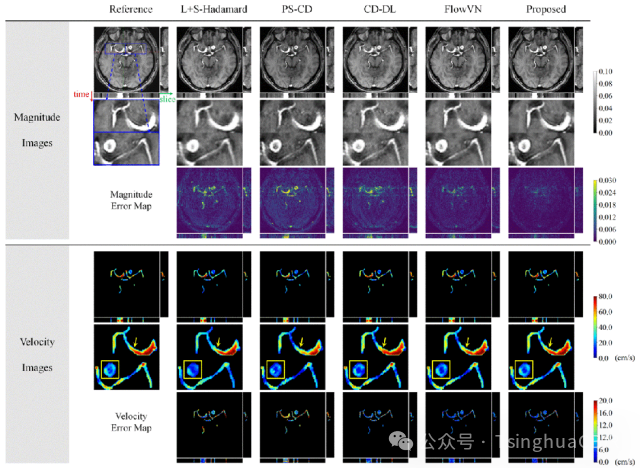 对比方法:L+S-Hadamard(基于L+S的低秩-稀疏传统算法),PS-CD(基于部分可分离模型以及复数差稀疏性的传统算法),CD-DL(模值图和复数残差分别独立学习的深度学习算法),FlowVN(基于迭代展开变分网络的深度学习算法)。