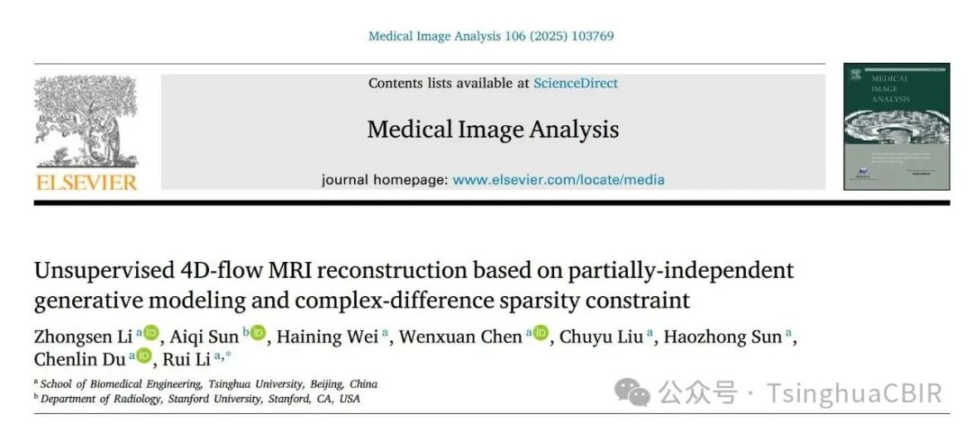 近期,清华大学生物医学工程学院生物医学影像研究中心在医学影像领域顶级期刊《Medical Image Analysis》上发表题目为“Unsupervised 4D-flow MRI reconstruction based on partially-independent generative modeling and complex-difference sparsity constraint”的论文