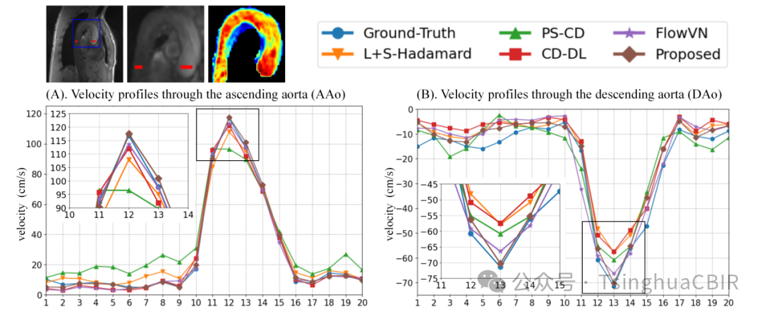 图 4. 所提出的方法与其他方法在16倍加速下,在升降主动脉处的心动周期血流对比