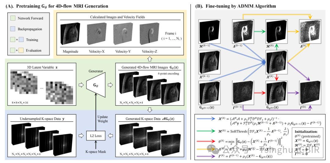 生成-稀疏联合约束的重建模型,以及预训练-ADMM微调的二阶段优化算法,可实现生成器与4D-flow MRI图像的交替式高效优化