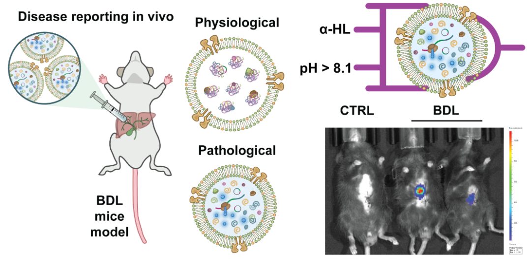 在BDL小鼠体内,人工细胞成功感知到局部的碱性信号,其内部的聚集体被解离,从而激活了CFPS进行荧光素酶的合成,最终产生了强烈且高度局域化的生物发光信号(图4)。