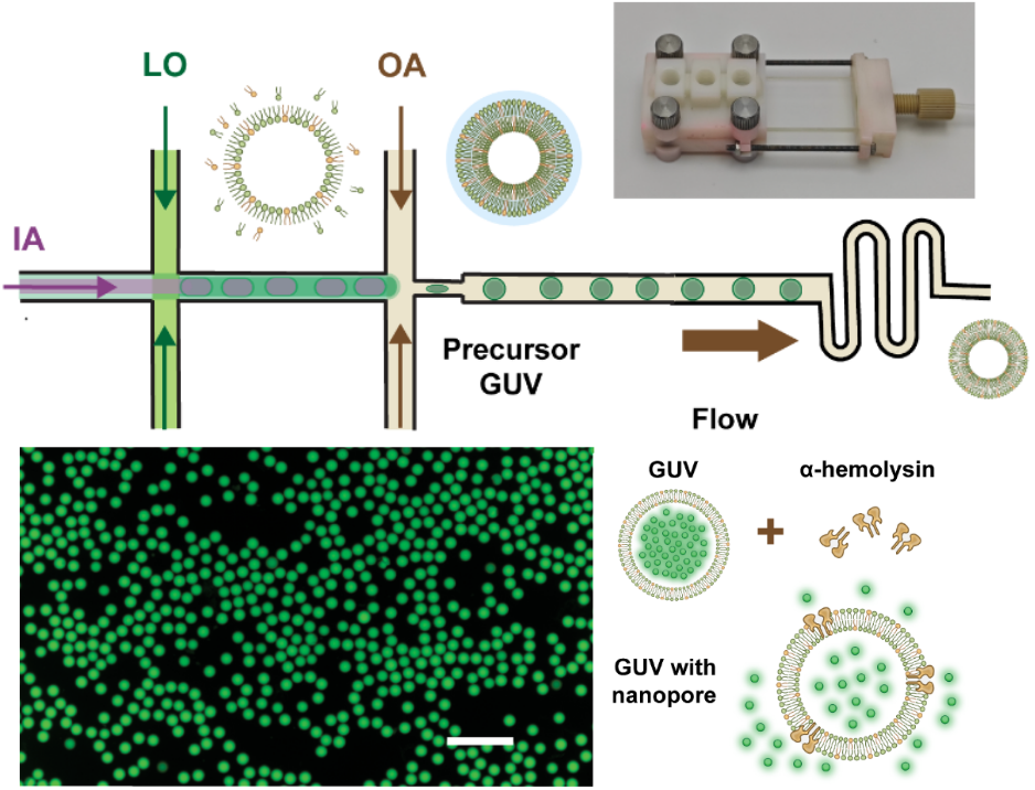 图2 基于微流控的微米囊泡制备系统,用于封装CFPS体系,并结合α-溶血素实现人工细胞的内外通讯