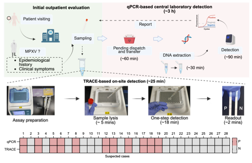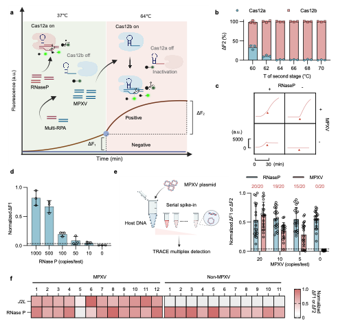 2025年11月21日,清华大学生物医学工程学院胡晔教授和吐露港生物科技有限公司王金博士领衔国际合作团队,在《Nature Communications》发表题为“热控一管式CRISPR猴痘现场监测系统”(Thermally programmed one-pot CRISPR assay for on-site pandemic surveillance)的研究论文(点击文末“阅读原文”查看更多论文信息)。该研究提出并验证了一种简易的一管式热调控异步CRISPR检测策略(thermally regulated asynchronous CRISPR-enhanced assay,TRACE)。该策略巧妙利用重组酶聚合酶扩增(RPA)、Cas12a和Cas12b检测系统之间的温度偏好差异,在同一反应体系内实现扩增与检测模块的空间耦合和时间解耦,首次构建了真正意义上的单步多重CRISPR检测系统,可在单管反应中同时检测病原靶标基因(如猴痘病毒J2L)和宿主内部质控基因(如RNase P)。在目前已报道的最大猴痘临床验证队列上,开展回顾性验证和前瞻性现场评估,TRACE最短11分钟即可完成检测,总体准确率高达99.5%。该技术克服了CRISPR诊断临床转化面临的关键技术障碍,有望成长为符合世界卫生组织(WHO)提出的“ASSURED”标准的现场即时检测关键平台,为未来突发传染病的快速监测与应急响应提供重要技术支撑(图1)。