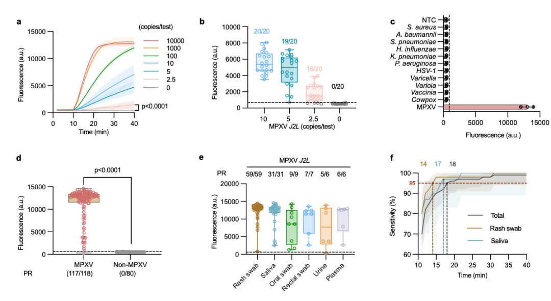 研究团队将TRACE嵌入门诊工作流程,开展前瞻性试点研究(图3)。TRACE成功识别全部28例具有高流行病学风险的有症状个体,其平均“样本到答案”时间仅约25分钟,而qPCR金标准检测则需约3小时,充分表明TRACE在与临床流程兼容的前提下,具备现场快速识别MPXV病例的显著即时检测优势。
