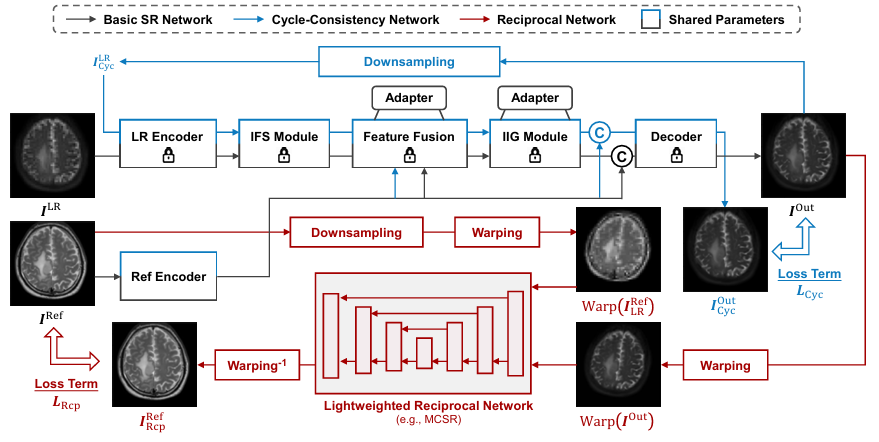在训练范式上,为了解决真实临床数据与预训练的公开数据集之间的Domain Gap,提出了基于多对比度MRI数据自相关性的测试时自适应框架,即:神经网络输出的超分结果应当具有丰富的高频细节,使其可以反向地作为“参考图像”,参与指导另一张低分辨率图像的超分。上述过程称为互惠学习(Reciprocal Learning)。图5红色箭头描述了互惠学习的实际过程,利用超分输出 (I^Out) 指导原参考图像的低分副本 (I^Ref_LR),通过约束生成的(I^Ref_Rcp) 从而间接地优化ISG网络。为了避免之前在公开数据集上训练的知识出现灾难性遗忘,采用了基于Adapter的部分参数微调策略。