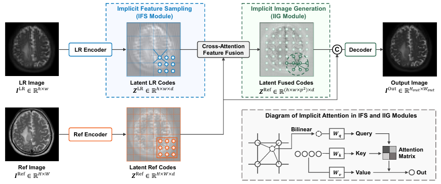在深度神经网络结构上,提出了隐式采样与生成(Implicit Sampling and Generation,ISG)。ISG网络利用基于学习的采样和隐式自注意力机制,注重于提取语义丰富区域特征,有效提升了超分图像细节的保真性。此外,不同医院采集的图像分辨率不一致,所需的超分上采样倍数也不相同。研究团队考虑到此点,所提出的ISG网络支持任意尺度输入、任意尺度上采样倍数(Arbitrary-Scale SR)。
