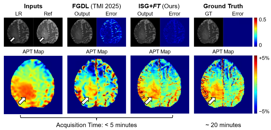 然而,受“分辨率-扫描时长”的关联制约,在临床病人扫描的有限时长内,很难同时获得高空间分辨率的多对比度图像。特别是对于信号本身就很低(~mM)的分子代谢磁共振,扫描慢和低空间分辨率是几十年来的长期痛点。例如,分辨率为0.9 * 0.9 * 2mm的一种代谢MRI,酰胺质子转移(APT), 其全脑采集大约需要20min。