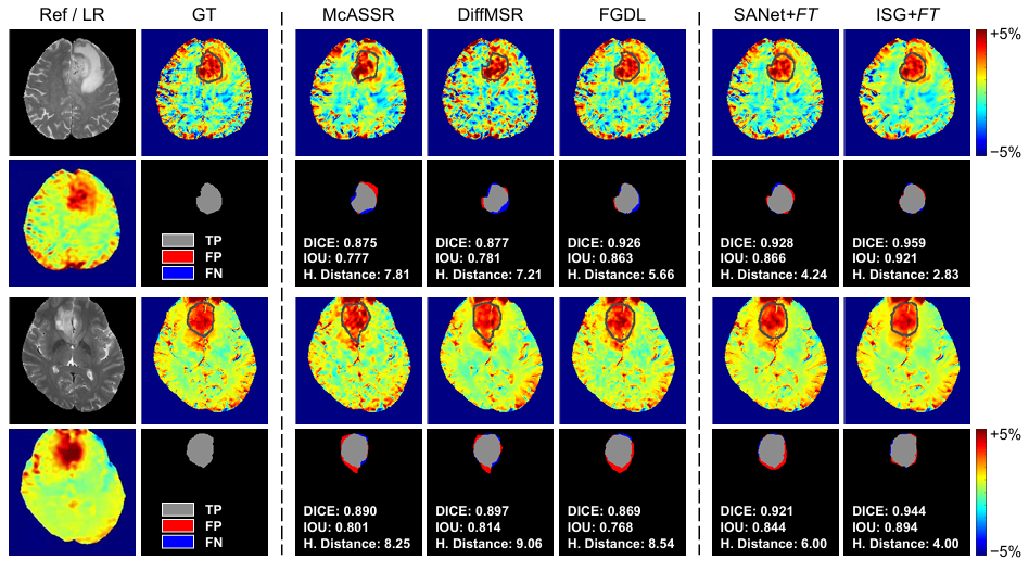 图3 在下游肿瘤分割任务上,证明ISG+FT超分辨网络可更好定义肿瘤边界