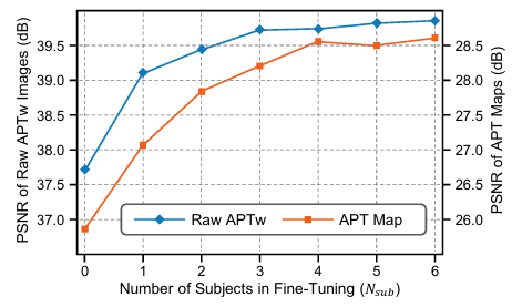脑肿瘤代谢图像测试:脑胶质瘤病人代谢APTw图像可有效进行肿瘤良恶性鉴别与复发检测;所提方法以病人自身结构像为参考,实现了对低分辨输入APTw图像的超分重建,使得20分钟的扫描时间缩短至约5分钟(图1)。值得一提的是,训练采用正常受试及不含APT的公开数据集,所提方法使得仅需4个肿瘤病人即达成收敛,证明可迁移至不同临床场景的泛化性(图2)。