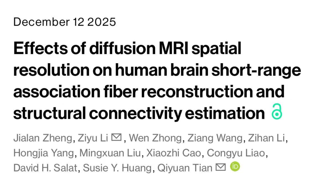 近日,清华大学生物医学工程学院田启源课题组脑影像实验室在神经影像领域顶级期刊《影像神经科学》(Imaging Neuroscience)在线发表题为“弥散磁共振成像空间分辨率对人脑短距离联络纤维重建与结构性连接估计的影响”(Effects of diffusion MRI spatial resolution on human brain short-range association fiber reconstruction and structural connectivity estimation)的研究论文。该研究系统评估了弥散磁共振成像策略对人脑距离联络纤维重建的影响,并构建了首个人脑短距离联络纤维比例图谱。论文第一作者为生物医学工程学院2025级博士生郑佳兰,通讯作者为生物医学工程学院田启源副教授与牛津大学博士后研究员李梓瑜博士(原生物医学工程系2021届本科毕业生),合作者包括清华生物医学工程学院、牛津大学、哈佛大学、斯坦福大学、加州大学旧金山分校等多所机构的学者。