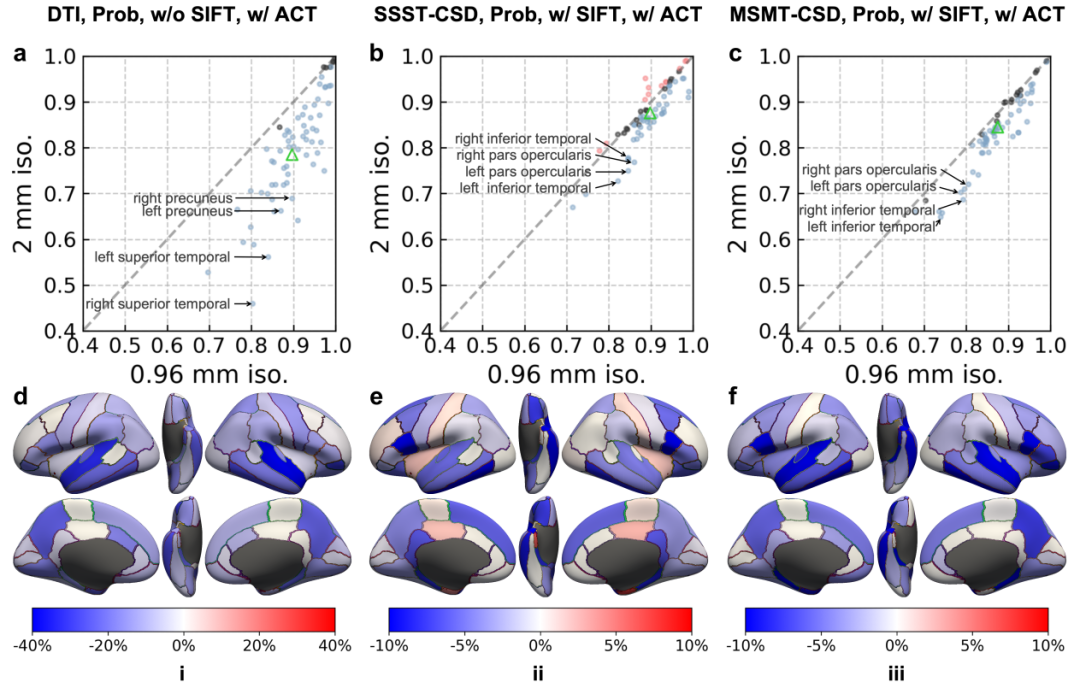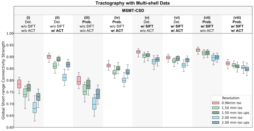 研究发现,较低的空间分辨率会显著低估SAF在脑结构性网络中的占比,其中颞叶区域受影响最为明显。研究进一步揭示,基于约束球面反卷积(CSD)的多纤维模型、结合解剖约束(ACT)与流线滤波(SIFT)的追踪策略对分辨率下降具有更强的鲁棒性。此外,研究还发现,对低分辨率数据进行上采样可在一定程度上改善重建效果,尤其对扩散张量成像(DTI)方法提升显著。