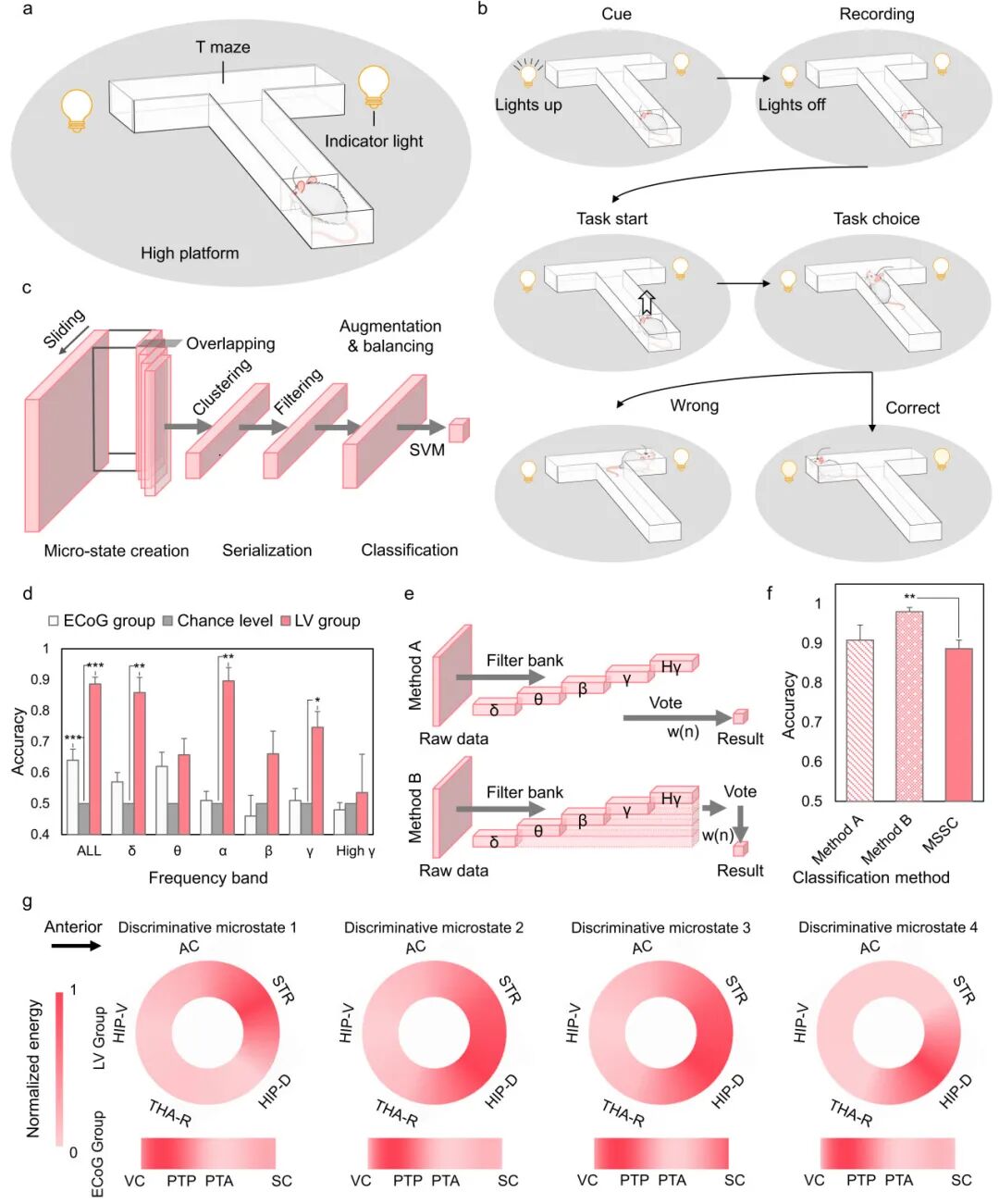在功能层面,研究进一步测试了脑室脑机接口在记忆引导决策任务中的表现。在T迷宫延迟选择范式中,基于脑室电极信号构建的分类模型对动物即将做出的选择具有更高预测准确率,最高接近98%,整体显著优于皮层 ECoG。特征分析显示,脑室接口捕获的判别信息更多涉及海马及纹状体邻近区域,提示其在获取与记忆和决策相关网络活动方面具有潜在优势。