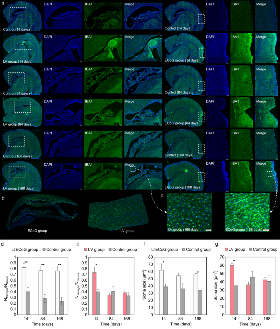 免疫组织化学结果进一步显示,皮层电极周围存在持续的微胶质细胞活化,而脑室电极仅在术后早期出现短暂反应,随后恢复至接近对照水平。结果提示,将电极置于脑脊液环境并减少与脑实质的直接机械耦合,有助于降低慢性炎症反应,从而支撑长期稳定记录。