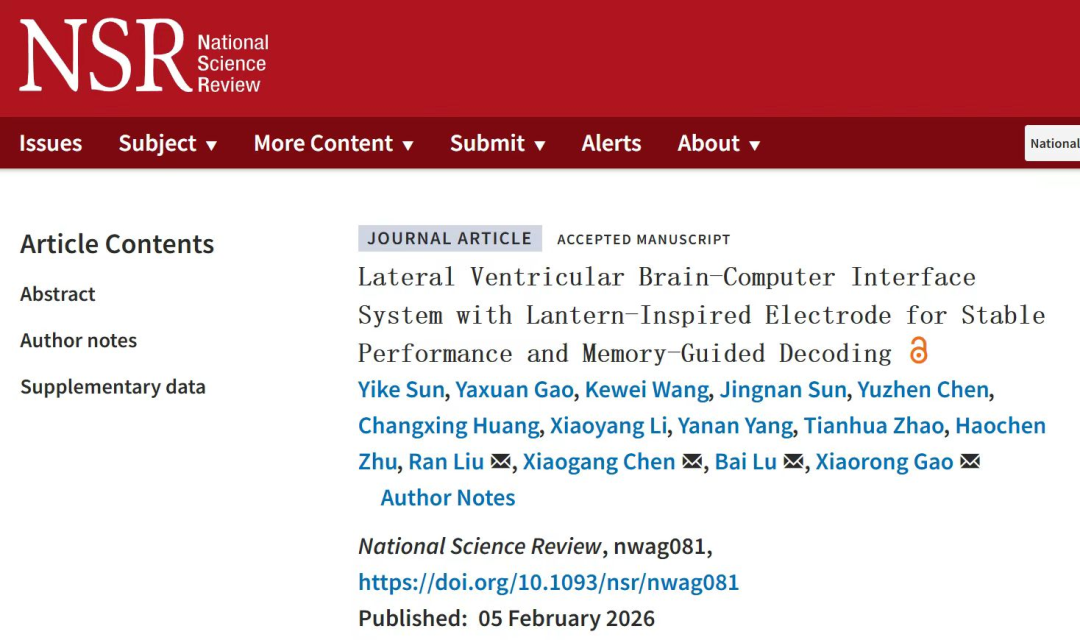 针对这一问题,清华大学生物医学工程学院高小榕教授、刘冉研究员、药学院鲁白教授与中国医学科学院陈小刚研究员团队于2026 年 2 月 5 日在National Science Review期刊在线发表题为“Lateral Ventricular Brain-Computer Interface System with Lantern-Inspired Electrode for Stable Performance and Memory-Guided Decoding”的研究论文。
