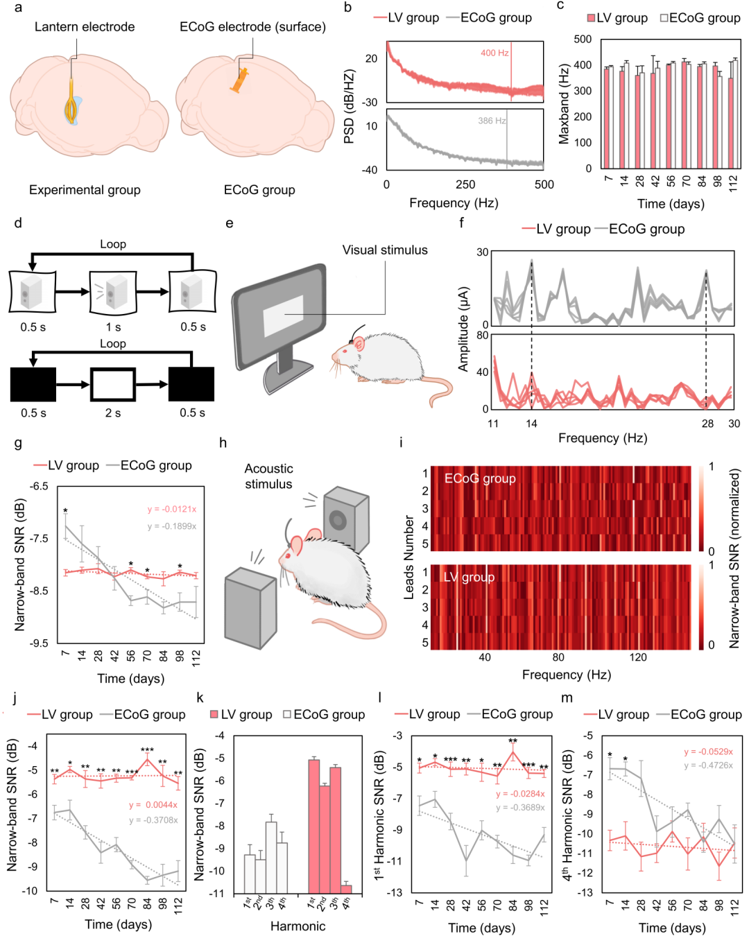 在长期动物实验中,研究团队将脑室电极与材料一致的皮层脑电(ECoG)电极进行对照。静息态频谱分析显示,两种电极在频率覆盖范围上相当,脑室位置并未显著限制高频信息获取能力。在视觉和听觉稳态诱发实验中,皮层电极在术后早期信噪比较高,但随时间呈现逐步下降趋势;相比之下,脑室电极在数月观察期内保持稳定,后期信号质量优于对照组。