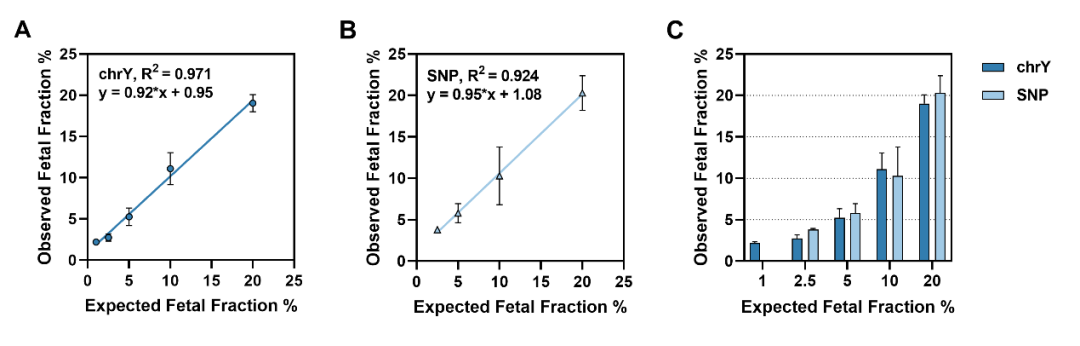 优异的检测灵敏度:对于Y染色体法,最低可检出1%的FF;对于SNP法,最低检出限为2.5%。