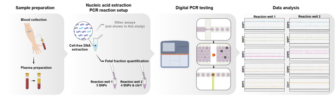 多重数字PCR检测:使用全自动数字PCR平台,在两孔反应体系中完成9个常染色体SNP位点和3个Y染色体位点的检测。