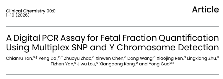 近日,清华大学生物医学工程学院郭永教授团队联合郑州大学第一附属医院、湖南医药学院、东莞市妇幼保健院和北京新羿生物,开发了一种基于多重单核苷酸多态性(Single Nucleotide Polymorphism, SNP)和Y染色体联合检测的数字PCR胎儿分数定量新方法。该方案通过创新的单探针双等位基因识别设计和三重Y染色体靶标策略,实现了无需父母基因分型、不依赖胎儿性别的FF精准定量,为基于数字PCR的产前游离DNA筛查的临床转化提供了关键质控工具。相关研究成果以《一种基于多重SNP和Y染色体检测的胎儿分数定量数字PCR方法》(A Digital PCR Assay for Fetal Fraction Quantification Using Multiplex SNP and Y Chromosome Detection)为题,于2026年2月26日发表在Clinical Chemistry期刊。