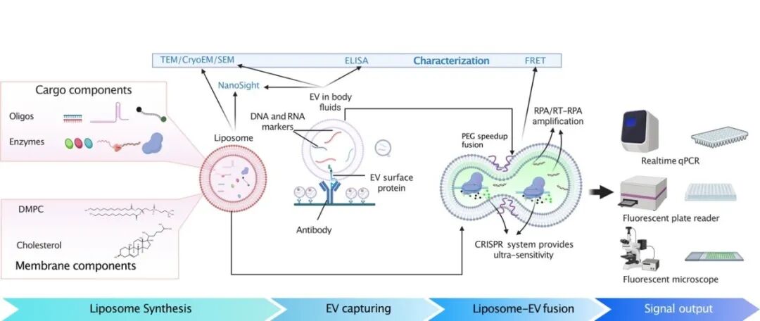 该研究分为四个关键阶段:脂质体构建 、EV抗体捕获 、脂质体–EV融合 、 CRISPR信号输出,具体解决方案如下。
