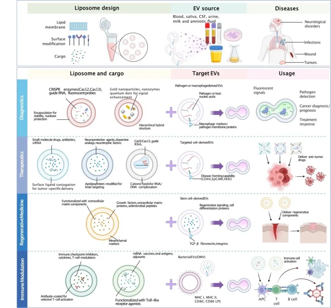 近日,清华大学生物医学工程学院胡晔教授团队联合美国杜兰大学宁波教授研究了一种用于液体活检的创新检测方法:脂质体–细胞外囊泡融合(Liposome–EV Fusion)+ CRISPR 分子诊断体系。该方法通过将核酸扩增与CRISPR检测系统直接递送进入EV内部,实现对体液中低丰度分子标志物的高灵敏、免分离检测,为感染性疾病、肿瘤及神经系统疾病的早期诊断提供了新的技术路径。相关研究成果以《液体活检中检测试剂直接递送至细胞外囊泡用于生物标志物分析》(Direct delivery of assay reagents to extracellular vesicles in liquid biopsies for biomarker analysis)为题,于2026年1月30日发表在 Nature Protocols 期刊上。