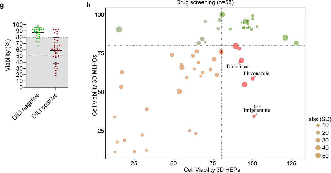 在药物筛查过程中,研究团队发现,多谱系肝类器官能够识别出一类在单一肝细胞模型中不易显现的损伤模式。这类损伤并非主要来自药物对肝细胞的直接打击,而更依赖于肝脏非实质细胞的参与及其与肝细胞之间的相互作用,提示模型具备解析“间接肝毒性”的独特优势。