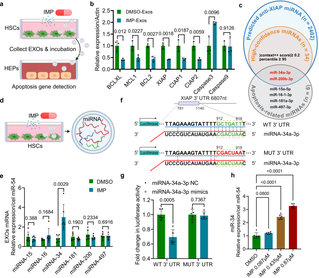 围绕这一发现,研究团队进一步解析了分子机制。结果表明,Imipramine作用于肝星状细胞后,可激活p53/hnRNPA2B1/DGCR8信号轴,促使miR-34a-3p被选择性富集到肝星状细胞分泌的外泌体中。这些外泌体随后被肝细胞摄取,将 miR-34a-3p 递送至受体细胞内,并抑制抗凋亡分子XIAP表达,最终激活 caspase-3 通路,引发肝细胞凋亡。