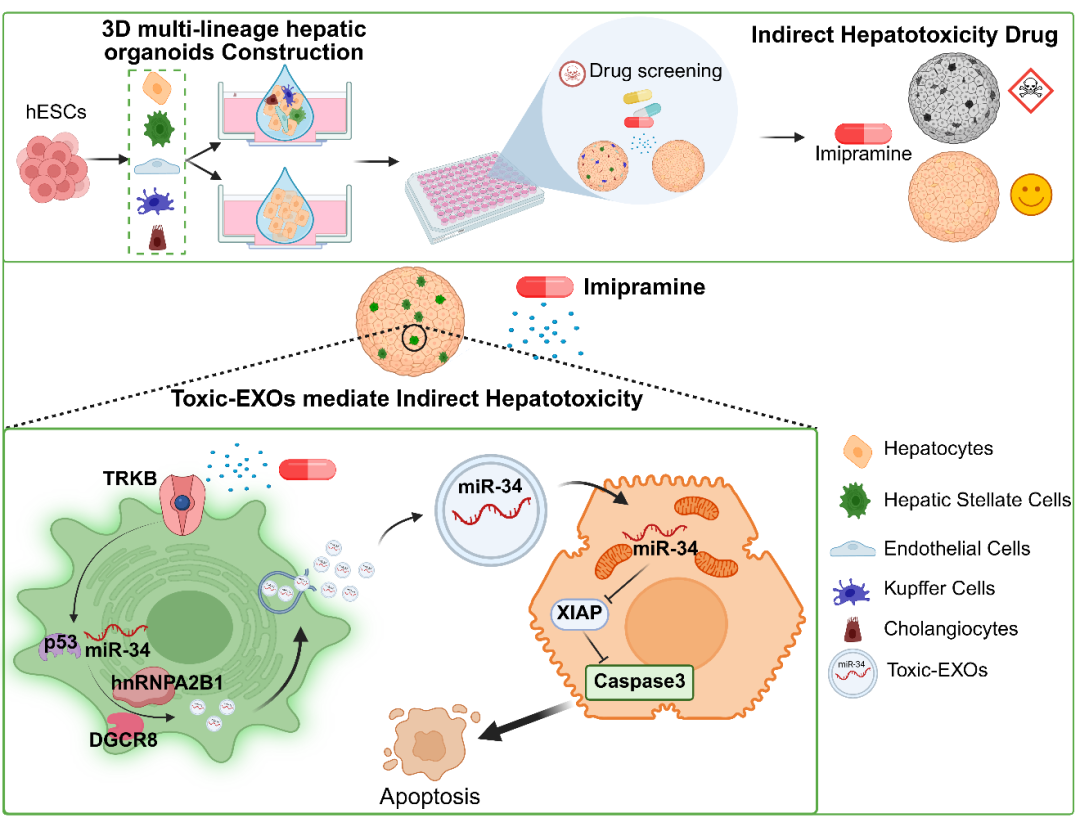 近日,清华大学生物医学工程学院杜亚楠教授团队与合作者在 Nature Communications 发表题为 “Multi-lineage hepatic organoids reveal toxic exosome mediated indirect hepatotoxicity” 的研究论文。研究团队构建了由人胚胎干细胞分化而来的五细胞谱系三维肝类器官,系统整合肝细胞、胆管细胞、肝星状细胞、内皮细胞和库普弗细胞,建立了更接近人体肝脏微环境的药物毒性评估平台。借助这一平台,团队不仅实现了对药物性肝损伤更高保真度的识别,还发现抗抑郁药丙咪嗪(Imipramine,IMP)可通过诱导肝星状细胞释放“毒性外泌体”,进而造成肝细胞凋亡,揭示了间接性肝毒性的全新机制。