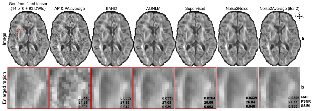 实验结果有力证实了 Noise2Average 的卓越鲁棒性与泛化能力。无论是在高加速 T1 加权成像,还是在复杂的多通道弥散磁共振数据中,该算法均实现了出色的降噪效果,并显著提升了下游微结构定量分析的精度。尤为关键的是,作为一种自监督方法,其性能已逼近监督学习的理论基准,充分确立了该框架在多模态 MRI 去噪及定量成像中的核心实用价值。