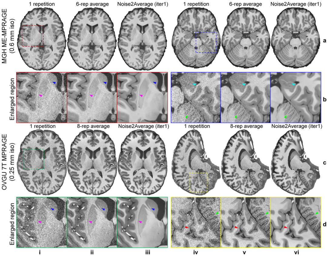 该研究提出的迭代残差学习图像降噪方法(Noise2Average),通过迭代残差学习策略实现磁共振成像多重复扫描数据的自监督降噪,在多种成像序列上显著提升图像信噪比,有效降低了临床扫描时间需求。此外,该研究还展示了 Noise2Average 在克服极高分辨率成像中固有信噪比瓶颈,在极低信噪比条件下恢复图像细节,从而实现了对微小精细结构的清晰呈现与分析的潜力。