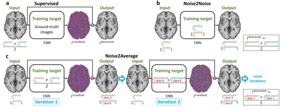 Noise2Average结合了迁移学习与自监督学习,利用多次重复采集的MRI图像内容一致但噪声不同的特点进行降噪。具体实现上,Noise2Average首先通过微调预训练卷积神经网络(CNN),学习建立从低信噪比的单次采集到相对高信噪比的多次采集平均值之间的映射关系;随后,它引入了迭代机制,将上一轮的降噪结果作为新的训练目标,通过反复的监督残差学习过程,不断增强图像特征并降低图像噪声,最终得到高信噪比图像。