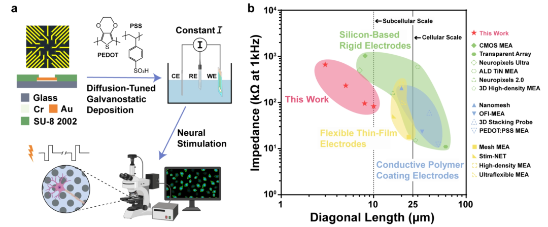 在脑机接口与神经科学的前沿领域,实现亚细胞尺度的神经调控已成为解码神经环路计算原理的关键挑战。神经元的信息处理过程高度局限于胞体、树突棘等微观膜结构,其空间尺度通常仅为几微米。然而,现有的细胞外刺激工具在面临亚细胞尺度(< 10 μm)的微型化需求时,往往陷入电化学性能的权衡困境:随着电极几何面积的剧减,界面阻抗飙升,导致电荷注入能力难以支撑有效的神经激活。