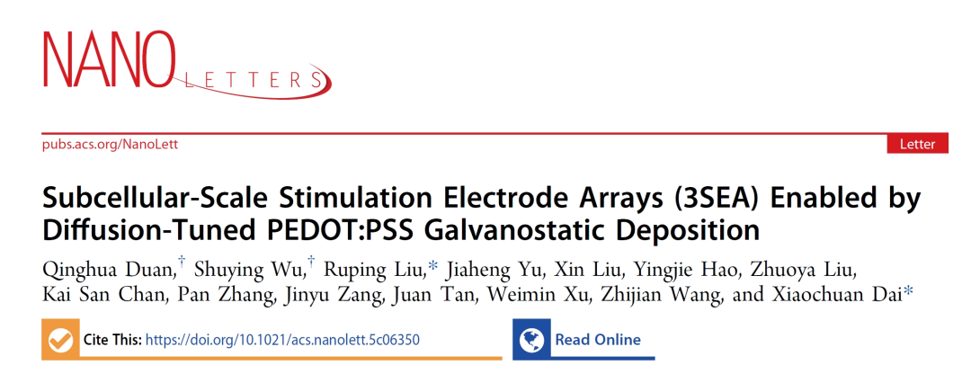清华大学生物医学工程学院戴小川副教授团队跳出了传统“对抗”沉积不均的思路,转而从电化学最基础的稳态扩散理论中汲取灵感。研究团队意识到,微米级电极的沉积过程本质上是一个高度受限的扩散调控过程。通过精确计算超微电极的稳态极限电流(Iss),团队创新性地提出了扩散调控的恒流沉积策略(Diffusion-Tuned Galvanostatic Deposition)。这一策略的核心在于“顺应”自然界的物理约束:将沉积电流严谨地限定在理论极限以下,使单体分子的消耗速度与扩散补充达成动态平衡,从而为每一个微小电极构建了稳定的质量传输环境。这种方法不仅消除了生长溢出,更在全阵列范围内实现了高度均一修饰,为高密度电极阵列的批量修饰提供了可靠的技术框架。相关研究成果以“Subcellular-Scale Stimulation Electrode Arrays (3SEA) Enabled by Diffusion-Tuned PEDOT:PSS Galvanostatic Deposition ”为题,于2026年3月3日在线发表在纳米领域权威期刊Nano Letters上。