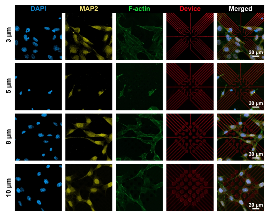 图4:HT-22 细胞在 3SEA 阵列上的粘附生长情况及亚细胞尺度尺寸对比